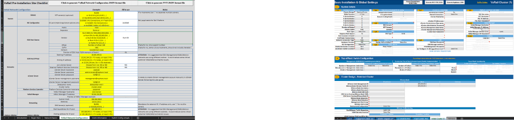 L’implémentation commence par l’acquisition des prérequis (NTP, DNS, adressage Mgt vMotion et vSAN, paramètres du Witness,…). Les prérequis sont tellement différentes et nombreuses que DellEMC a mis en place un fichier Excel (nommé PEQ, précédemment Preinstallation checklist) basé sur des Macros afin de centraliser toutes ces informations et pour enfin générer un fichier JSON qui nous facilitera la tâche. Voici un aperçu du fichier en comparaison de son prédécesseur: