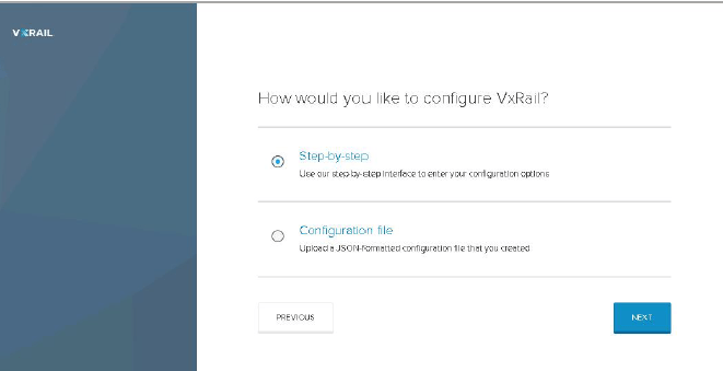 Comme nous pouvons le remarquer, le Stretched Cluster n’est pas proposé. Il sera possible de le configurer une fois VxRail déployé. Donc l’installation du Witness n’est pas nécessaire pour le moment, ni pendant l’étape de découverte précédente. Une fois les nœuds sont affichés au complet, on choisi le mode de configuration: soit manuel, qui nécessite la saisie de toute la configuration manuellement, soit via le fichier JSON généré depuis le PEQ: