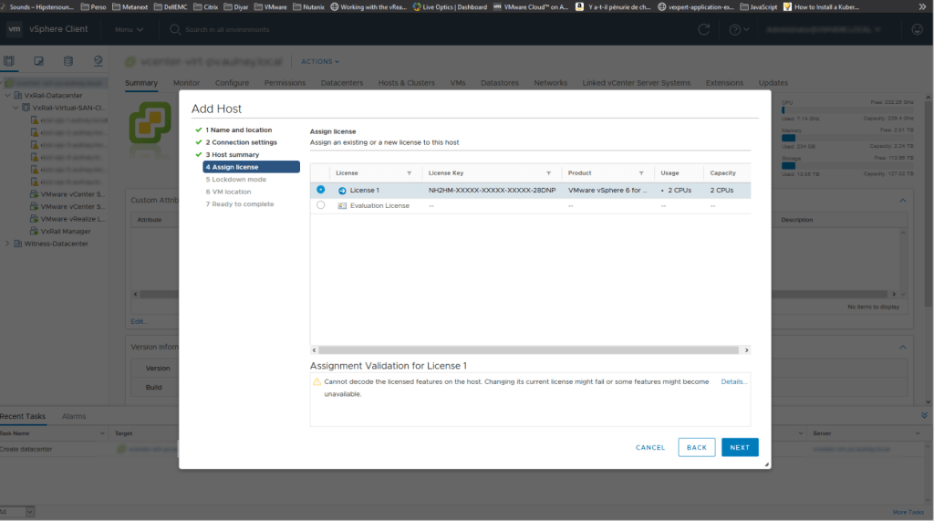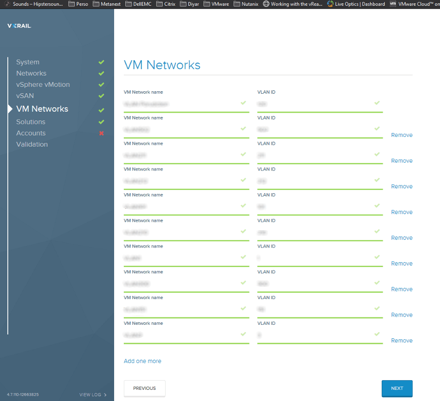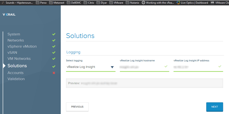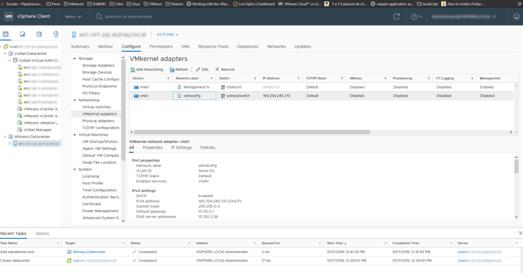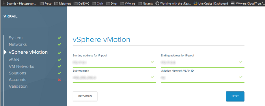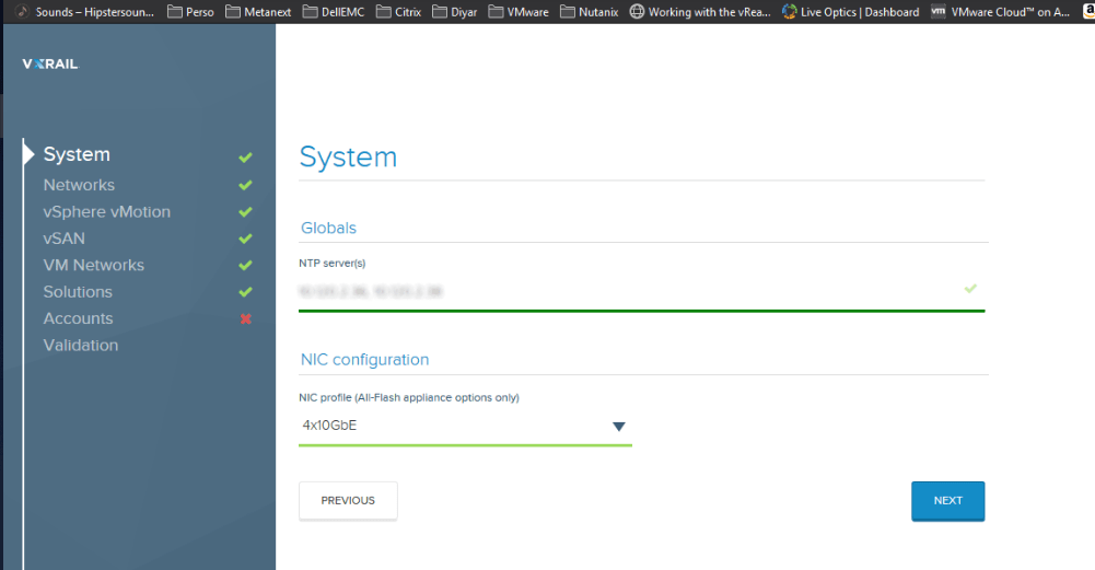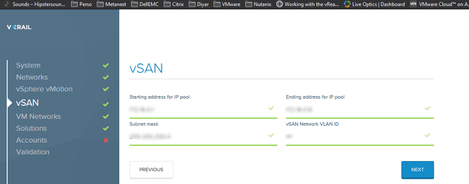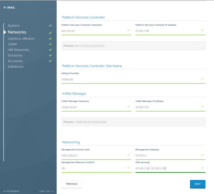 Configuration du PSC, VxRail Manager, du réseau de Management et DNS. Il est à noter que le PSC est livré en externe avec VxRail. A partir de la version 6.7 de vCenter, le PSC externe n’est pas supporté. J’ai contacté le support à ce sujet et ils m’ont confirmé que le PSC externe est supporté pour le cas de VxRail et que le Embeded PSC sera disponible dans les prochaines release VxRail. Donc inutile de penser à converger le PSC 🙂 .