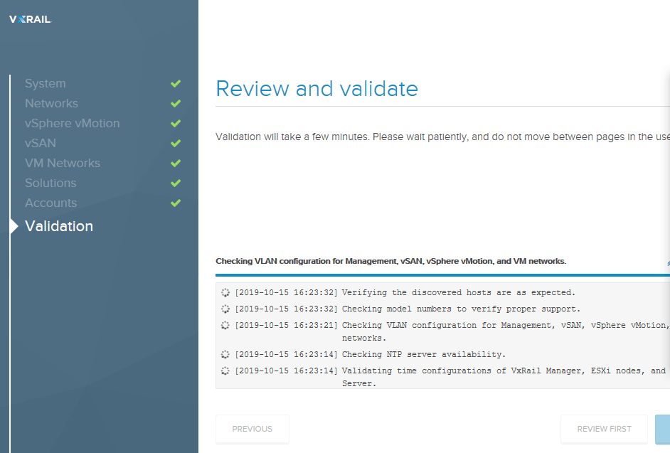 Les paramètres requis ont été introduits, le VxRail procèdera à la validation de la configuration avant de procéder au déploiement. Le processus de validation consiste à vérifier la disponibilité des paramètres ainsi que la consistance de la configuration. Si la validation échoue pour n’importe quelle raison (indisponibilité DNS par exemple) il sera impossible de passer à l’étape suivante tant que le problème n’est pas résolu.