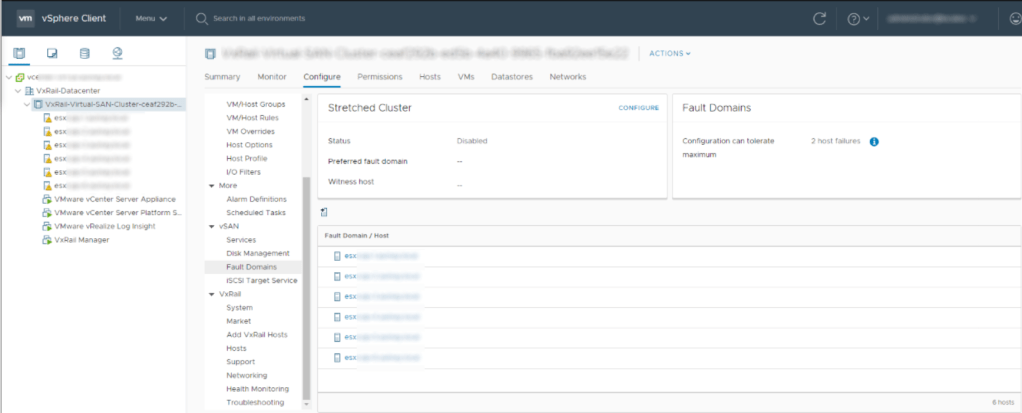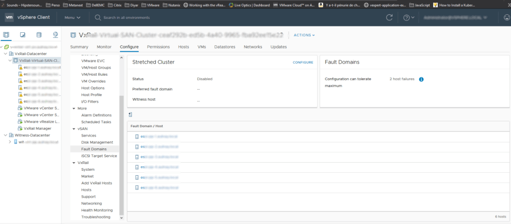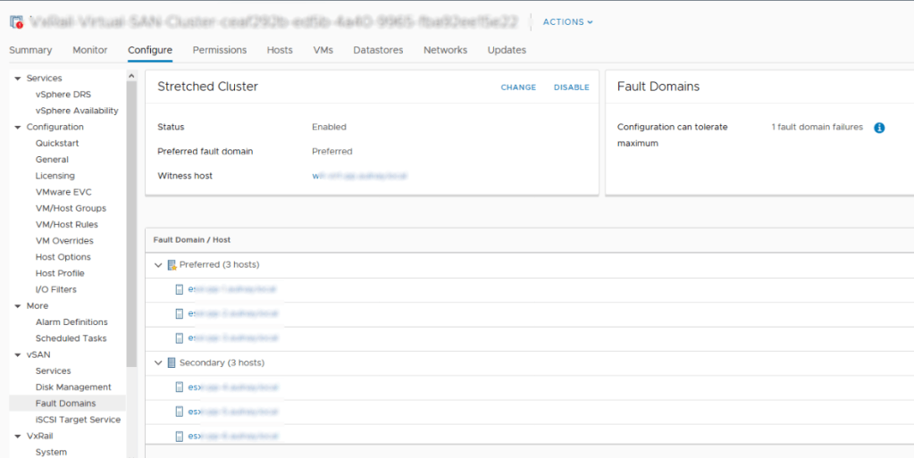 Le process consiste à ajouter le Witness et répartir les nœuds de chaque site en configurant les fault domain vSAN: définir le preferred et le secondary fault domain. Pour notre cas, nous avons 2 sites et chaque site comporte 3 nœuds