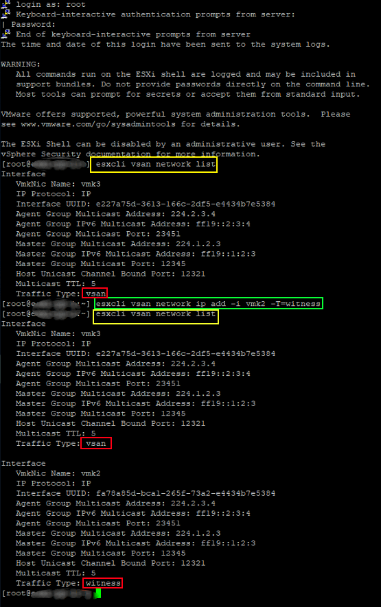 Une fois les port group configurés, nous activons le trafic Witness sur le VMkernel de Management sur chaque nœud ESXi d’où le # représente le numéro du port VMkernel de Management. Se connecter en SSH et taper la commande: