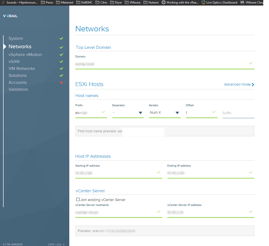 L’installation et la configuration des ToR switch jouent un rôle crucial sur le succès d’une implémentation VxRail. Je profite de cette occasion pour remercier un de mes anciens collègues Anas Awad (CCIE R&S #62739) qui a su répondre aux challenges par lesquelles nous faisons face et avec qui j’ai beaucoup appris afin d’optimiser et suivre les best practices pour une implémentation VxRail. Une fois les prérequis réseau communiqués à l’équipe réseau (VLAN, Trunk des ports, IPV6 Multicast pour le management, IPV4 Unicast pour vSAN, etc…) et tester la joignabilité NTP, valider les entrées DNS et vérifier la disponibilité des adresses IPs, nous pouvons commencer le déploiement. Les étapes ci-dessous sont présentées après avoir câblé correctement les nœuds aux ToR et configurer les iDRAC.