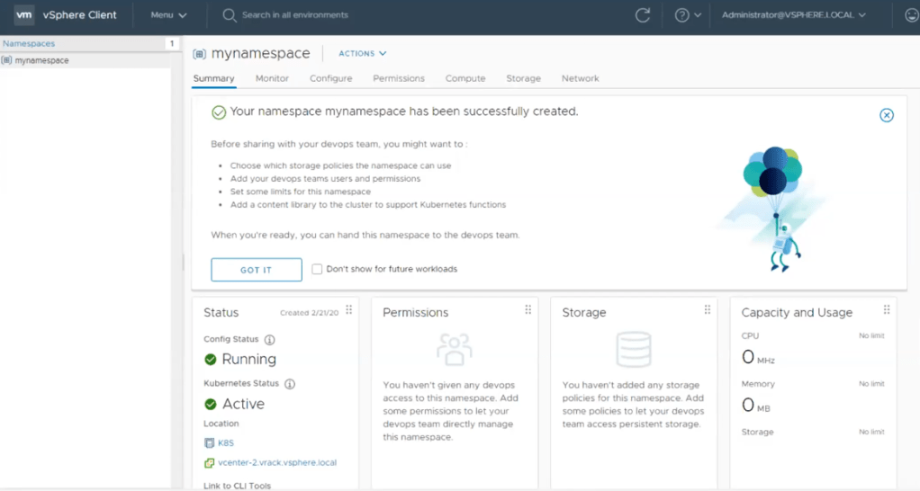 Une fois le cluster de Workload Management activé, nous avons la possibilité de créer les namespaces: