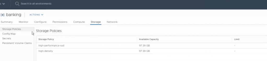 En sélectionnant le cluster, un nouvel onglet a été ajouté sur le vCenter afin d’administrer les namespaces. En cliquant sur le namespace « banking », nous obtenons une description globale du namespace et aussi la possibilité d’ajouter les permissions, de modifier la politique de stockage (vSAN, VMFS, NFS) et la gestion des ressources de management en définissant ses limites d’utilisation: