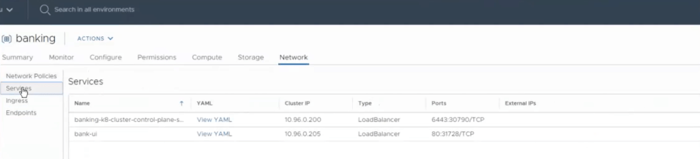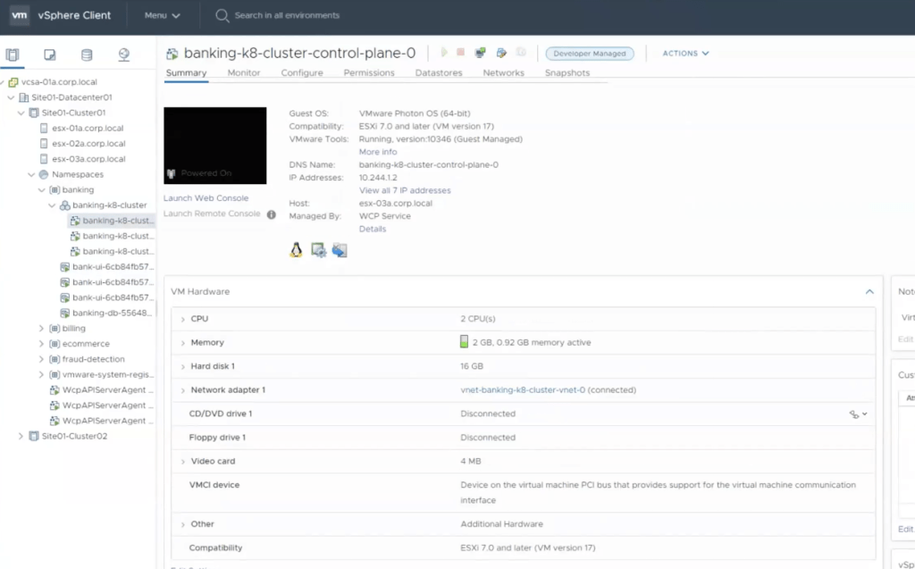Le cluster est automatiquement déployé sous l’objet namespace – banking de l’interface graphique vCenter:
