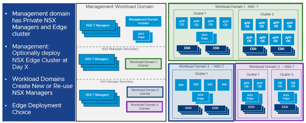 Management domain: dédié pour les tâches de management et d’infrastructure et composé de 4 nœuds (3x NSX-T Managers et Management Domain vCenter). Parmi les nouveautés: PSC embedded, NSX Manager et Controllers intégrés, déploiement des cluster NSX Edge jour 0/X.