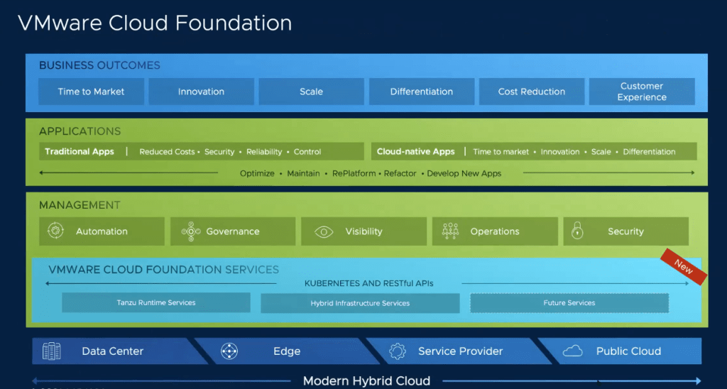 VMware Cloud Foundation a d’ores et déjà fourni une plateforme de virtualisation et de monétisation. Le projet Pacifique a permis aujourd’hui d’étendre cette plateforme directement au développeurs par divers services tel que Tanzu Runtime Services, Hybrid Infrastructure Services .
