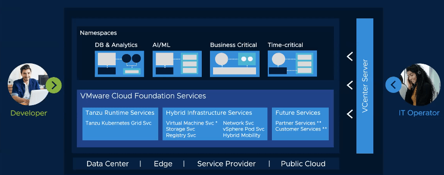 VMware Cloud Foundation permet d’offrir un ensemble de services managés similaires au Opérateur Cloud (AWS, Azure) d’un point vue développeur, disponible partout, là où VCF est disponible. Permettre d’avoir accès au Cluster Kubernetes depuis des interfaces APIs. Les services de stockage, réseau, vSphere Pod (qui permet l’exécution des Pods Kubernetes nativement depuis l’hyperviseur) permet l’amélioration de la performance et de la sécurité.