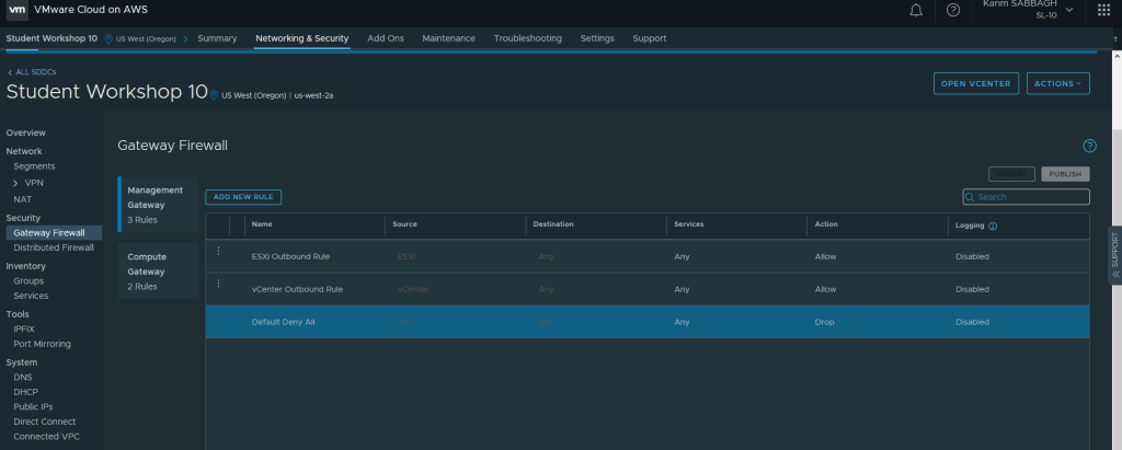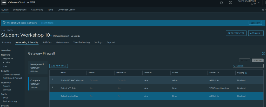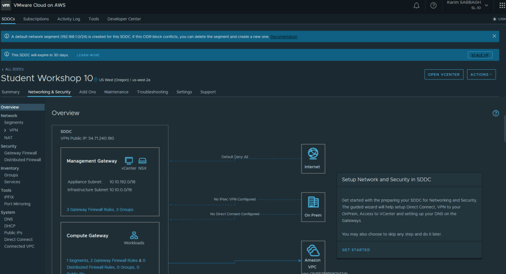 Sur l’onglet Réseau et Sécurité, nous avons un aperçu de la connectivité réseau du SDDC. Accès Internet, Accès On-premise et l’accès VPC AWS. Seule la connexion avec le VPC AWS est automatiquement établi durant le déploiement.