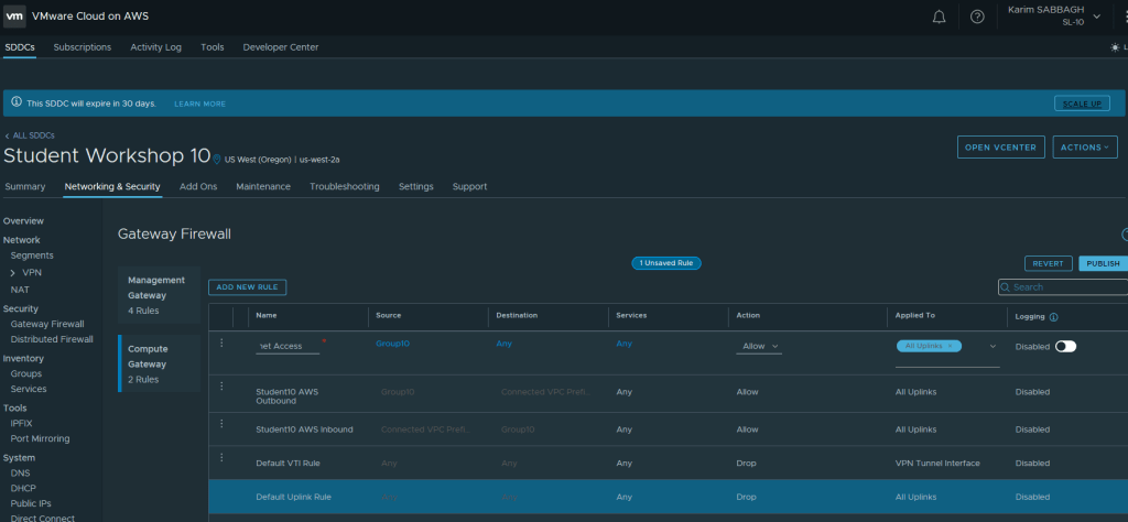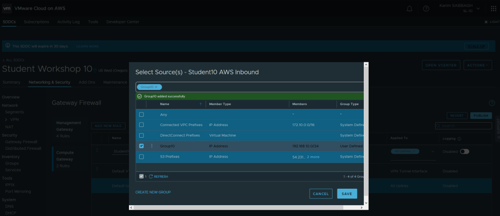 Insérez le sous réseau de votre SDDC (pour plus d’information sur le sous réseau VMC on AWS, revoir mon article Mise en réseau et sécurité de VMware Cloud on AWS)